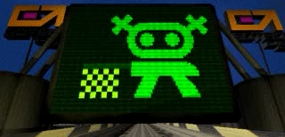 The Curly announcer screens stand at the start of the race, in groups of two or three. As soon as Curly has finished counting, she will permanently say "GO!" while blinking. Curly is usually blue, but she changes colour while counting (red) and while saying "GO!" (green).