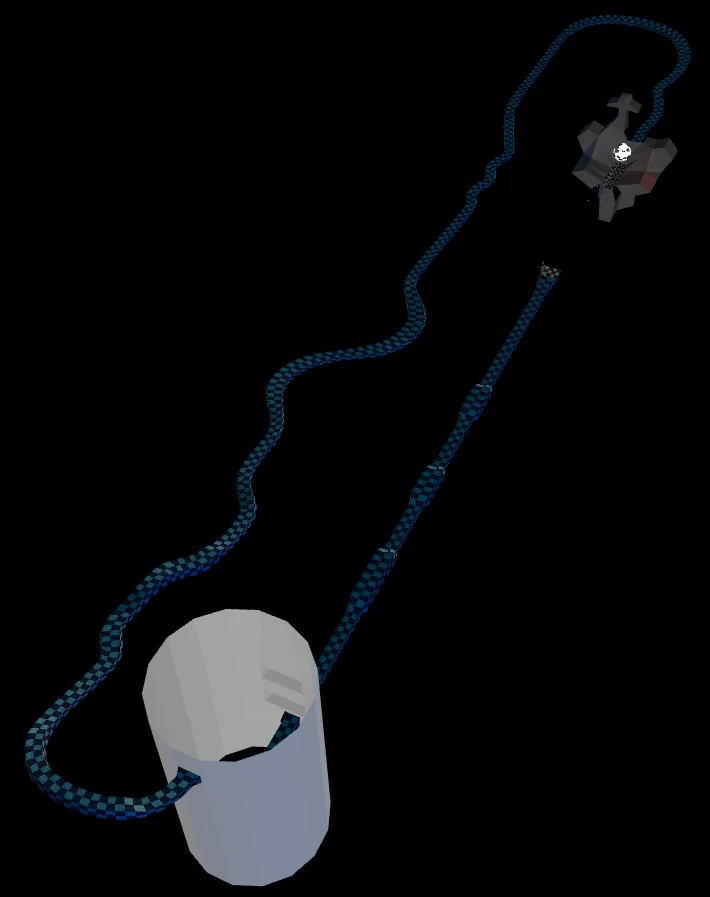Since the track remains in an unfinished state, it has no speed or weapon pads and lacks scenery, apart from two untextured structures - a cylinder enclosing the first jump; and a building with a red light, a T-shaped tower, and what appears to be a satellite dish, which the second jump flies directly into. The second jump also features floating landing lights leading to its entrance. The rest of the track is entirely enclosed.